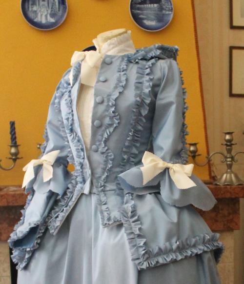 Abito storico da viaggio femminile realizzato in taffetta azzurro composto da: