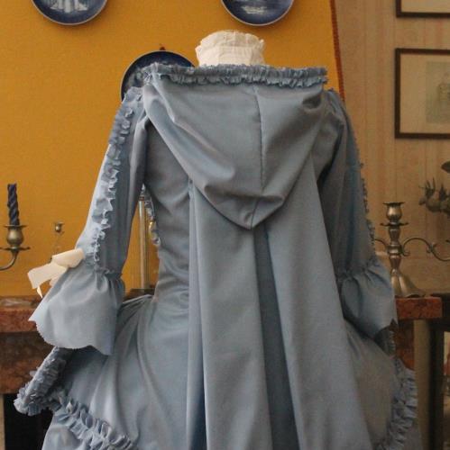 Pet - en - l'air con cappuccio con applicazioni di ruches sul bordo e su gran parte del corpetto, maniche staccabili con bottoncini in stoffa. il corsetto ha doppia chiusura: sul retro con stringhe e anteriore con bottoncini in stoffa.