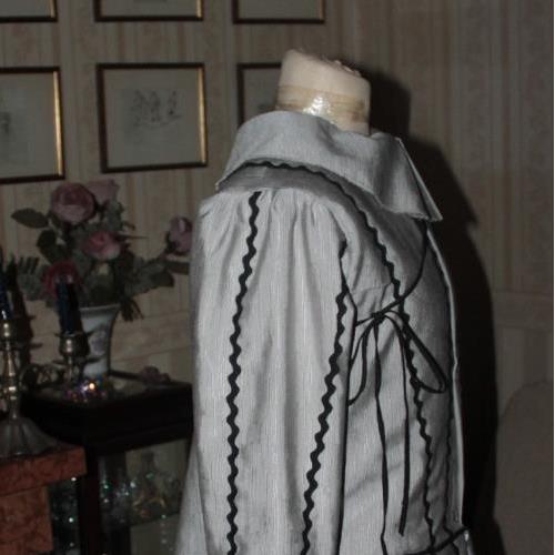 Abito realizzato in lino pesante color grigio chiaro composto da farsetto realizzato in lino color grigio chiaro con chiusura con bottoncini rivestiti di stoffa.reso rigido da imbottitura color bianco, applicazione di passamaneria nera su gran parte del farsetto e delle manichpantaloni al ginocchio realizzati in lino color grigio e cappa rifinita da passamaneria nera