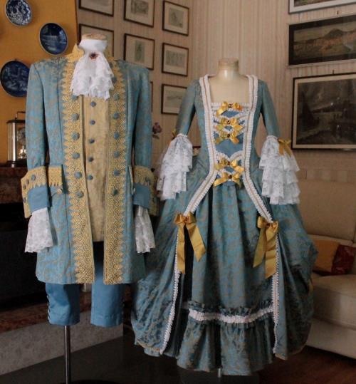 ABITO STORICO MASCHILE 1700 realizzato in damascato azzurro con disegni in oro composto da pantalone in raso azzurro con bottoncini in stoffa Gile' in damascato color oro e bottoncini in stoffa color azzurro Giacca in damascato color azzurro con disegni color oro rifinito con merletto macrame' senape bottoni in stoffa Camicia in puro cotone bianco con balza in pizzo bianco Jabot in cotone bianco con numerose balze di pizzo bianco Abito adatto per cortei storici, rappresentazioni teatrali carnevale di Venezia e altro