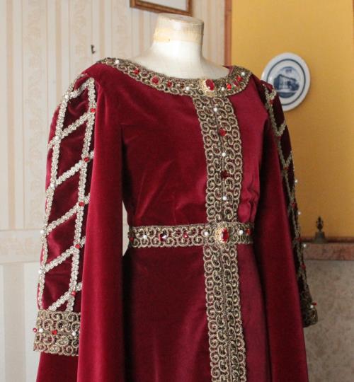 Abito costume storico realizzato in velluto bordò con applicazioni preziose di passamanerie e perle come da foto