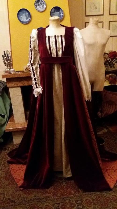 Abito costume storico femminile fine XV secolo, realizzato artigianalmente in velluto bordò, broccato panna con disegni bordò